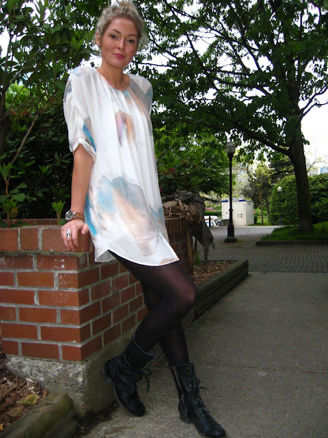 Jacket: Talula ~ Shirt Dress: Wilfred ~ Boots: Jeffery Campbell ~ Watch: fantastic find at a vintage shop ~ White Stone Ring: Thrifted ~ Silver Ring: from Bali ~ Silver Bangles: H&M ~ Bag: Abro